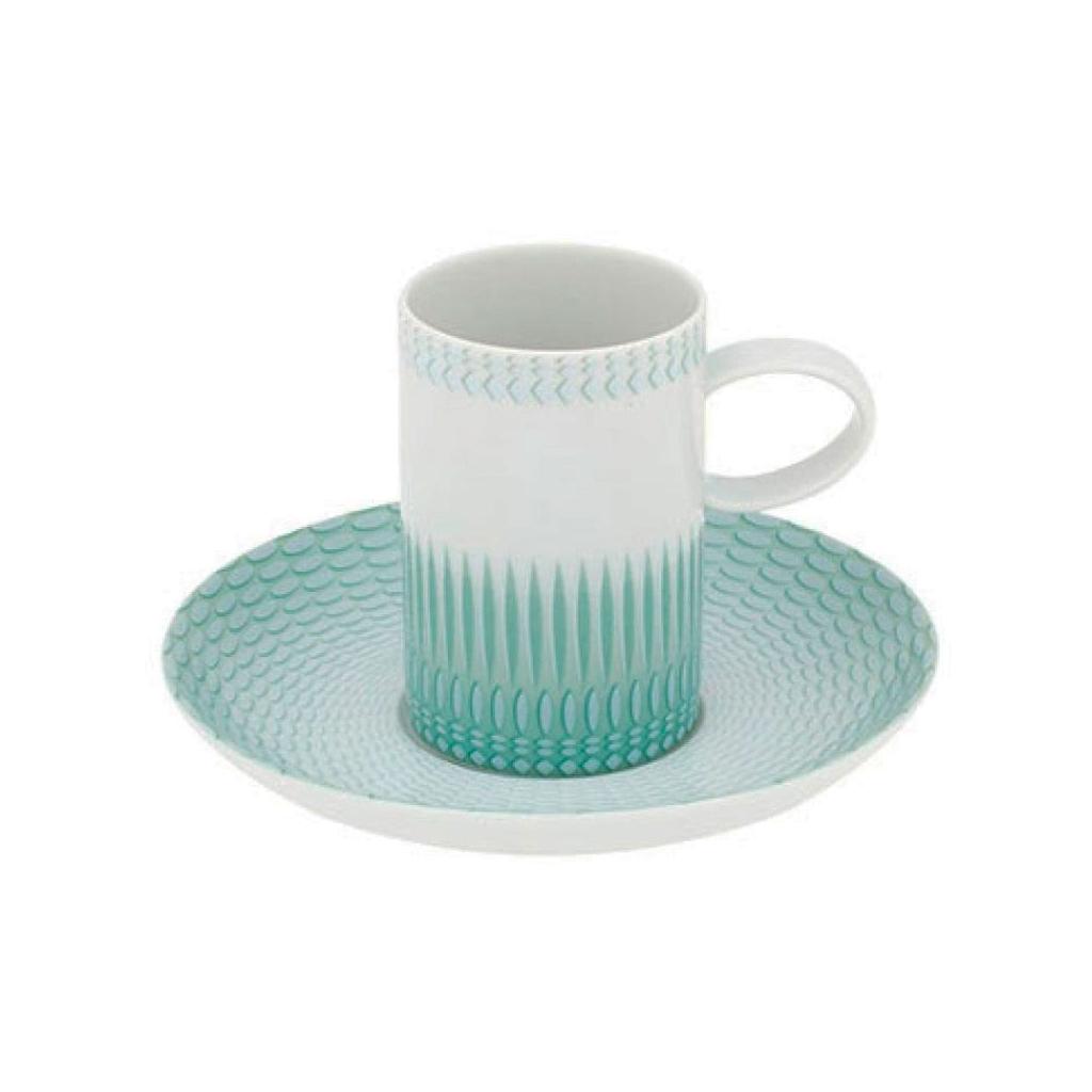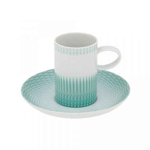 A sofisticação das formas e da decoração a platina contrastam com a delicadeza do relevo, finalizado com um toque de cor em degradé. Os pratos e as chávenas prescindem da platina, para uso no microondas. Contemporaneidade prática com pormenores de elegância e distinção